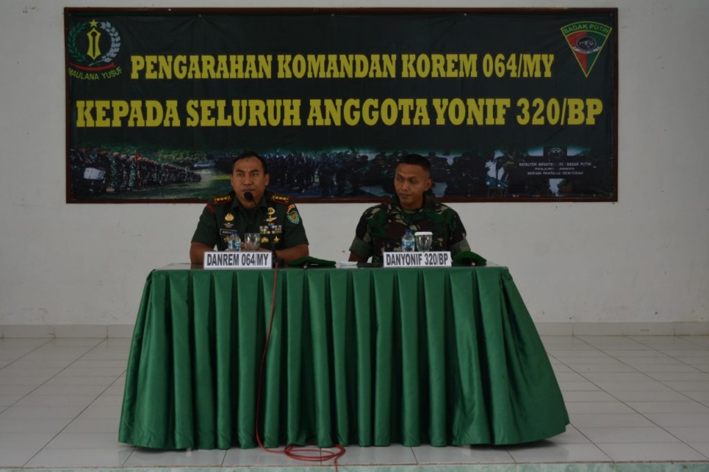 Serang – Dalam rangka pembinaan personil Danrem 064/MY Kolonel Inf Windiyatno memberikan arahan kepada seluruh anggota Prajurit Yonif 320 Badak Putih yang dilaksanakan di Aula Mayonif 320 Badak Putih Cadasari Pandeglang, Senin (04/02/2020)